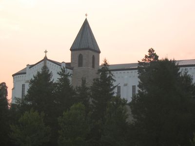 Die Abtei Unserer Lieben Frau von Gethsemani erstreckt sich über 810 Hektar Ackerland mit einem dreistöckigen neugotischen Klostergebäude.