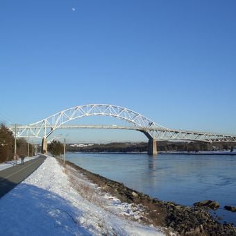 Die Stahlbogenbrücke überspannt 188 Meter über den Cape Cod Kanal, mit vier Fahrspuren und einem Fußgängerweg.