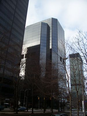 Das Eaton Center ist ein Wolkenkratzer aus Glas und Stahl in der Innenstadt von Cleveland mit 28 Geschossen. Die Fassade besteht aus einer modernen Kombination reflektierender Glasflächen und Stahlrahmen, die das Gebäude prägt.