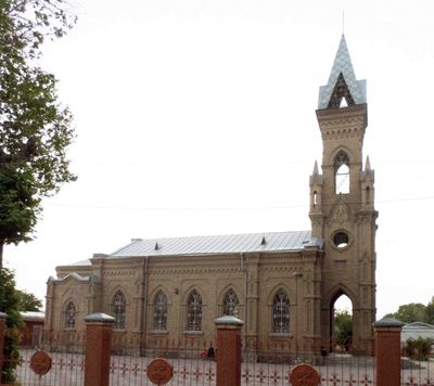 St. John the Baptist Church ist eine gotische Wiederbelebungskirche in Samarkand mit Spitzbögen, verlängerten Fenstern und dekorativen Mustern aus dem frühen 20. Jahrhundert. Das Gebäude zeigt den europäischen Baustil, der von polnischen und deutschen Gemeinden in dieser zentralasiatischen Stadt geprägt wurde.