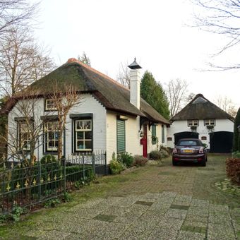 Dwarswoning onder met pannen gedekt schilddak met bedrijfdeel onder rieten schilddak