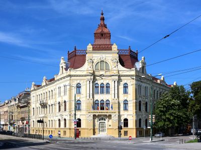 Architekt Lipót Baumhorn entwarf das Gebäude im Sezessionsstil und integrierte neobarocke Elemente, die den ungarischen Architektureinfluss in Timișoara darstellen.