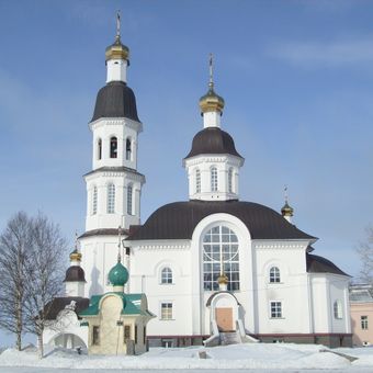 Die Mariä-Entschlafens-Kirche zeigt die strukturellen Merkmale einer traditionellen russisch-orthodoxen Kirche mit oktagonalem Design und Kuppelturm.