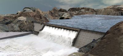 Das Überlaufsystem verfügt über 12 Öffnungen mit einer Kapazität von 7.856 Kubikmetern pro Sekunde und verwaltet den Wasserfluss aus einem Einzugsgebiet von 4.843 Quadratkilometern.